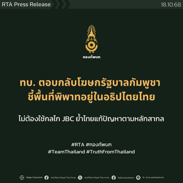 วันที่ 18 ต.ค. 68 พล.ต.วินธัย สุวารี โฆษกกองทัพบก ชี้แจงกรณีที่นายเพ็ญ โบนา โฆษกรัฐบาลกัมพูชา ออกแถลงการณ์ไม่ยอมรับว่าพื้นที่ บ้านหนองจานแล ะบ้านหนองหญ้าแก้ว รวมถึงพื้นที่ที่ฝ่ายไทยวางลวดหนาม และใช้รถปรับพื้นดินเพื่อกวาดล้างทุ่นระเบิดอยู่ในเขตแดนไทยว่า