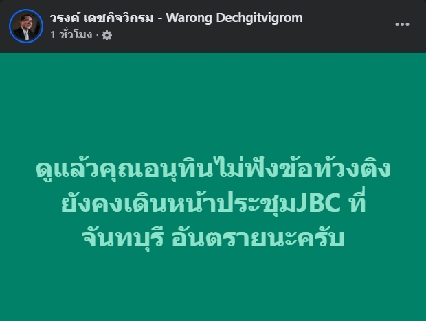 พร้อมระบุข้อความว่า เร่งประชุม JBC เลยวันพรุ่งนี้ ที่จันทบุรี