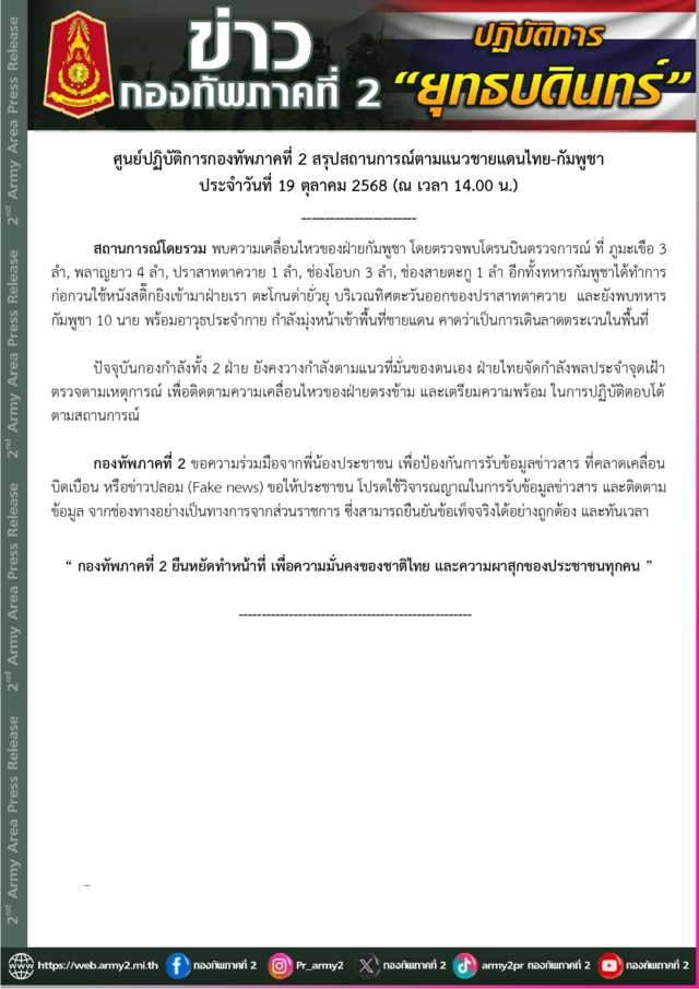 ศูนย์ปฏิบัติการกองทัพภาคที่ 2 สรุปสถานการณ์ตามแนวชายแดนไทย-กัมพูชา ประจำวันที่ 19 ตุลาคม 2568 (ณ เวลา 14.00 น.) ว่า สถานการณ์โดยรวม พบความเคลื่อนไหวของฝ่ายกัมพูชา โดยตรวจพบโดรนบินตรวจการณ์ ที่ ภูมะเขือ 3 ลำ, พลาญยาว 4 ลำ, ปราสาทตาควาย 1 ลำ, ช่องโอบก 3 ลำ, ช่องสายตะกู 1 ลำ