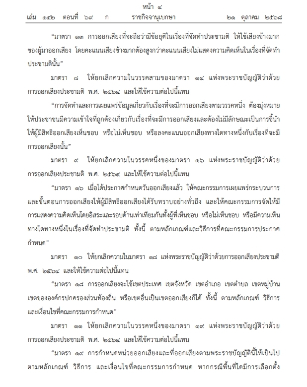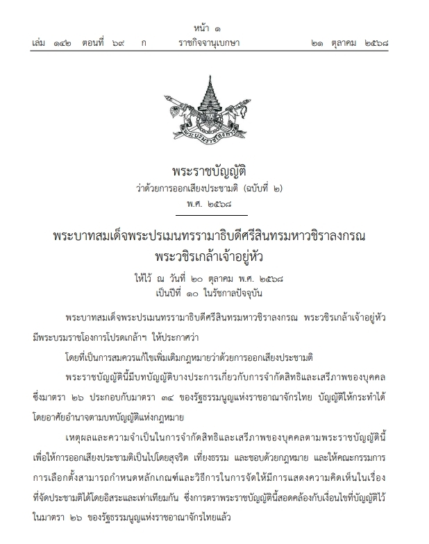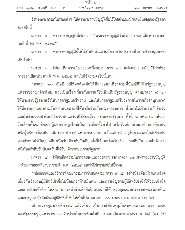 วันที่ 21 ตุลาคม 2568 ผู้สื่อข่าวรายงานว่า ราชกิจจานุเบกษา เผยแพร่ พระบรมราชโองการโปรดเกล้าฯ พระราชบัญญัติ (พ.ร.บ.) ว่าด้วยการออกเสียงประชามติ (ฉบับที่ 2) พ.ศ. 2568 ซึ่งจะมีผลบังคับใช้ตั้งแต่วันที่ 22 ต.ค. 2568 เป็นต้นไป โดยมีทั้งหมด 12 มาตรา