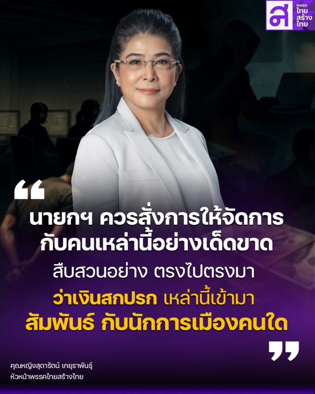พรรคไทยสร้างไทย โดย คุณหญิงสุดารัตน์ เกยุราพันธุ์ หัวหน้าพรรคไทยสร้างไทย ได้โพสต์ข้อความ ว่า "นายกฯ ต้องแสดงความจริงใจในการปราบ "ทุนเทา-สแกมเมอร์" อย่างถึงรากถึงโคน"