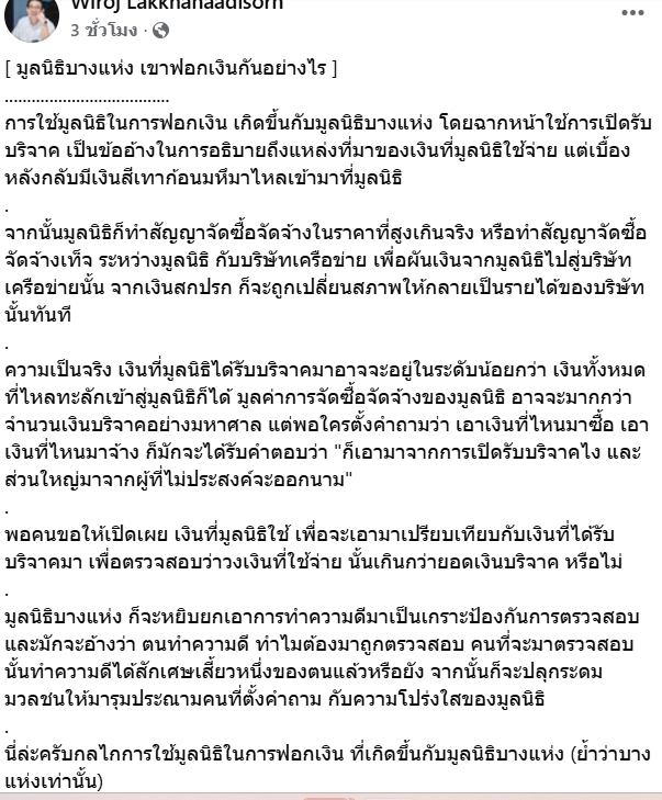 23 ต.ค.68 นายวิโรจน์ ลักขณาอดิศร ส.ส.บัญชีรายชื่อ และรองหัวหน้าพรรคประชาชน โพสต์ข้อความผ่านเฟซบุ๊ก โดยระบุว่า มูลนิธิบางแห่ง เขาฟอกเงินกันอย่างไร