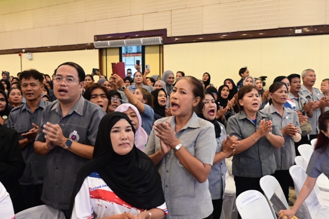โดยทันทีที่นายกรัฐมนตรีมาถึง กล่าวทักทายเป็นสำเนียงใต้ ว่า สวัสดีครับ นี่มาแหล่งรอบ 2 เมื่อสักครู่ต้องขออภัยเห็น กลุ่มอสม. กลุ่มสตรี ที่อยู่ด้านนอก ไม่สบายใจ แต่เพิ่งมาทราบว่าหอประชุมจัดได้ทีละชุด ชุดแรกคือกลุ่มผู้นำองค์กรปกครอง ส่วนท้องถิ่นชุดที่ 2 ถึงจะเป็นชุดของกลุ่มสตรีแม่บ้าน แล ชาวอสม. มาตรงนี้อบอุ่นจริงๆ และก็ได้ไถ่บาปไปแล้ว เห็นพี่น้องอยู่ข้างนอก ตนก็ไม่ยอมขึ้นรถ วิ่งไปหาพี่น้องก่อน ท่ามกลางรู้สึกอึดอัดที่เห็นประชาชนรออยู่ด้านนอก แต่อย่างไรก็ต้องขออภัยด้วย ทั้งหมดเป็นความผิดของนายพิพัฒน์คนเดียว ก่อนกล่าวว่าพูดเล่น