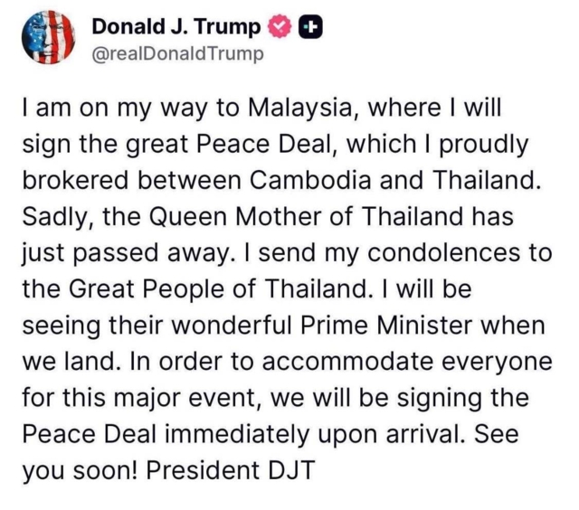 เมื่อวันที่ 26 ต.ค.ประธานาธิบดีโดนัลด์ ทรัมป์ ของสหรัฐฯ เผยผ่านโซเชียลว่า กำลังมาเลเซีย เพื่อจะลงนามในข้อตกลงสันติภาพ ระหว่างไทย-กัมพูชา ซึ่งทรัมป์ย้ำว่า ตนเองเป็นผู้ไกล่เกลี่ย พร้อมขอแสดงความเสียใจกับคนไทยที่สมเด็จพระนางเจ้าสิริกิติ์ พระบรมราชินีนาถ พระบรมราชชนนีพันปีหลวง เสร็จสวรรคต