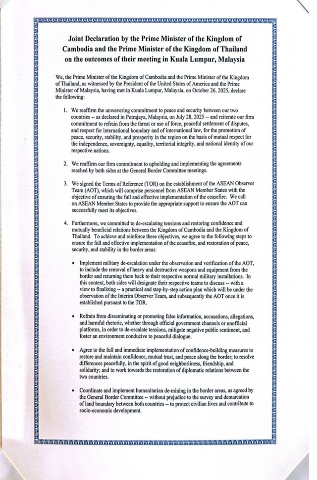 1) ผู้นำไทยและกัมพูชาแสดงเจตนารมณ์ต่อสันติภาพและความมั่นคงระหว่างสองประเทศ ตามที่เคยประกาศไว้ ณ เมืองปุตราจายา เมื่อ 28 กรกฎาคมที่ผ่านมา โดยย้ำความมุ่งมั่นที่จะละเว้นการคุกคามและใช้กำลัง แก้ไขข้อพิพาทโดยสันติ เคารพต่อเขตแดนและกฎหมายระหว่างประเทศ เพื่อส่งเสริมสันติภาพ เสถียรภาพ และความรุ่งเรืองร่วมกันในภูมิภาค