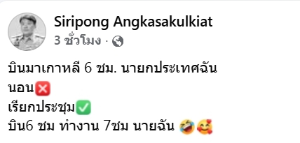 วันที่ 29 ต.ค.2568 นายสิริพงศ์ อังคสกุลเกียรติ โฆษกประจำสำนักนายกรัฐมนตรี โพสต์เฟซบุ๊กส่วนตัวเป็นภาพของนายอนุทิน ชาญวีรกูล นายกรัฐมนตรี และรมว.มหาดไทย ขณะนั่งพูดคุยเตรียมการกับคณะระหว่างเดินทางบนเครื่องบินเพื่อเข้าร่วมการประชุมผู้นำเขตเศรษฐกิจเอเปค ครั้งที่ 32 ที่เกาหลีใต้ระหว่างวันที่ 29ต.ค.-1พ.ย.นี้ พร้อมระบุข้อความว่า บินมาเกาหลีฯ 6 ชม. นายกฯประเทศฉัน นอน(ไม่ใช่) เรียกประชุม(ใช่) บิน6ชม. ทำงาน7ชม. นายฉัน