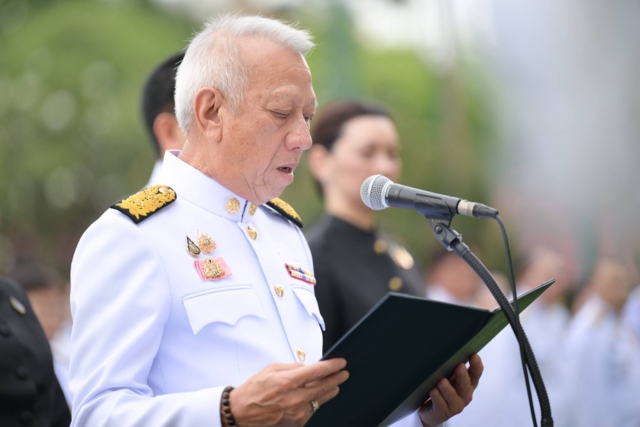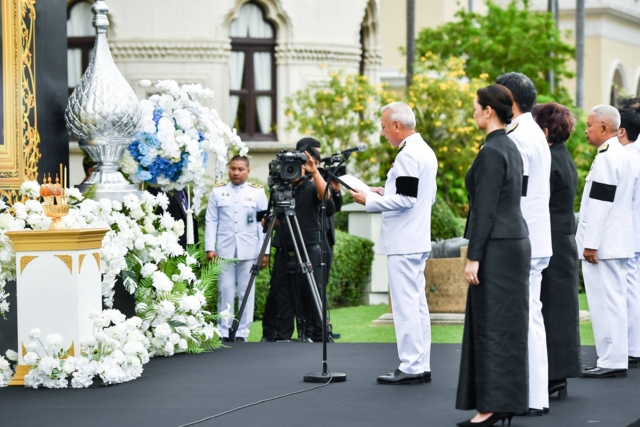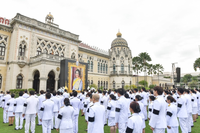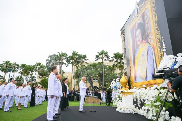 ในโอกาสนี้ ขอให้ผู้ที่ชุมนุมกันสถานที่แห่งนี้ พร้อมใจกันยืนสงบนิ่ง เพื่อน้อมราลึกถึงพระมหากรุณาธิคุณอันหาที่สุดมิได้ของ สมเด็จพระนางเจ้าสิริกิติ์ พระบรมราชินีนาถ พระบรมราชชนนีพันปีหลวง และขอเทิดทูน พระองค์ไว้เหนือเกล้าเหนือกระหม่อมตราบนิจนิรันดร