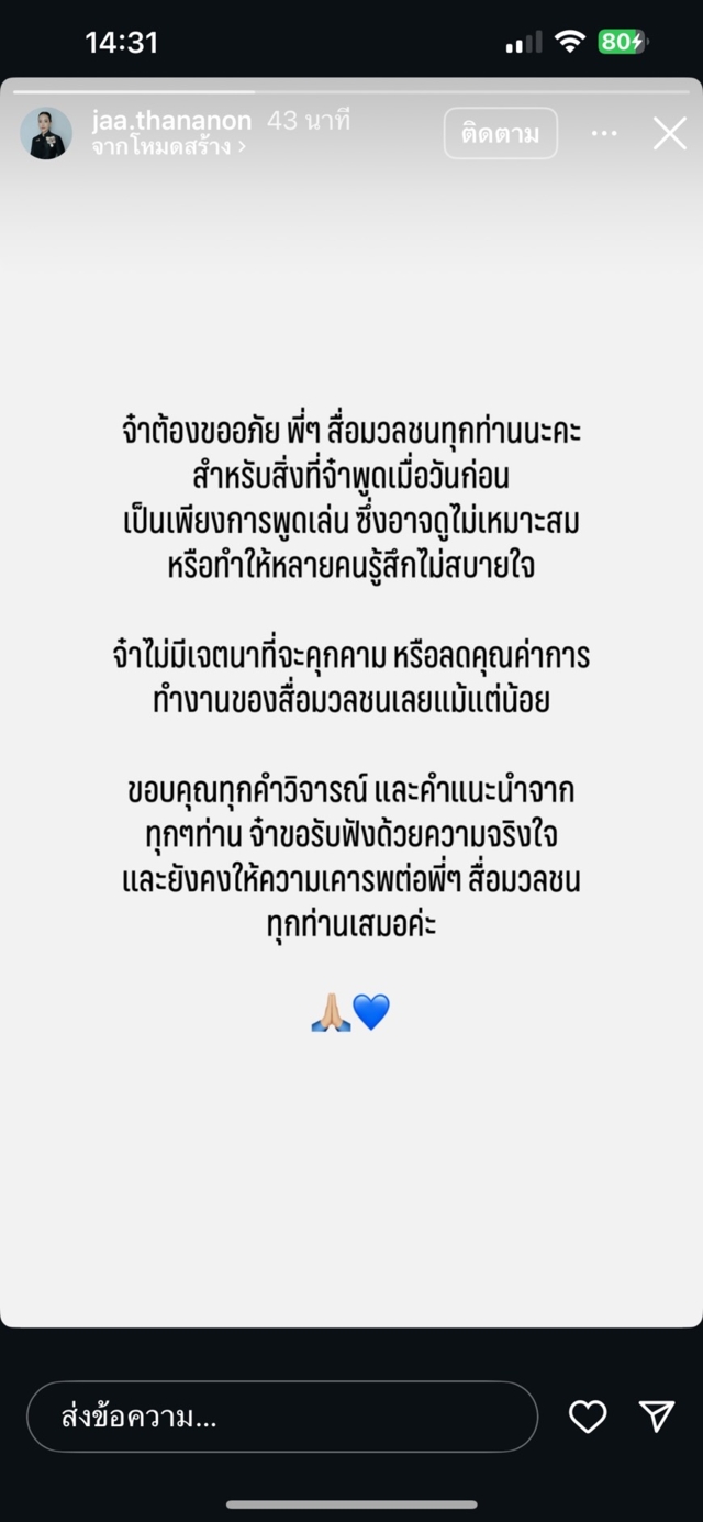 โดย น.ส.ธนนนท์ ระบุว่า “จ๋าต้องขออภัยพี่ๆ สื่อมวลชนทุกท่านนะคะ สำหรับสิ่งที่จ๋าพูดเมื่อวันก่อน เป็นเพียงการพูดเล่น ซึ่งอาจดูไม่เหมาะสม หรือทำให้หลายคนรู้สึกไม่สบายใจ จ๋าไม่มีเจตนาที่จะคุกคาม หรือลดคุณค่าการทำงานของสื่อมวลชนเลยแม้แต่น้อย”