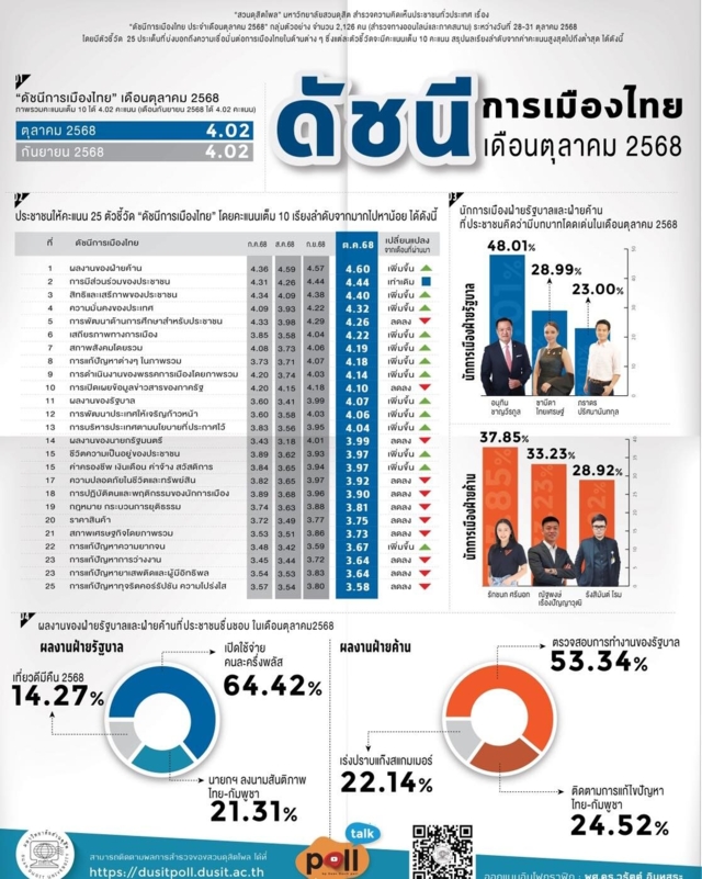 วันที่ 2 พ.ย.2568 สวนตุสิตโพล มหาวิทยาลัยสวนดุสิต สำรวจจความคิดเห็นประชาชนทั่วประเทศ เรื่อง “ดัชนีการเมืองไทย ประจำเตือนตุลาคม 2568” กลุ่มตัวอย่าง จำนวน 2.126 คน (สำรวจทางออนไลน์และภาคสนาม) ระหว่างวันที่ 28-31 ตุลาคม 2568 พบว่า กลุ่มตัวอย่างให้คะแนนภาพรวม ดัชนีการเมืองไทยประจำเดือนตุลาคม 2568 เฉลี่ย 4.02 คะแนน เท่ากับเดือนกันยายน 2568 ที่ได้ 4.02 คะแนน