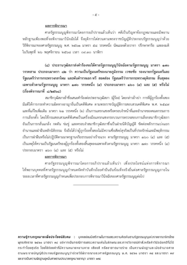 เมื่อวันที่ 3 พ.ย.2568 ศาลรัฐธรรมนูญ ได้นัดประชุมปรึกษาคดีที่ ประธานวุฒิสภาส่งคำร้องขอให้ศาลรัฐธธรรมนูญวินิจฉัยตามรัฐธรรมนูญ มาตรา 170 วรรคสาม ประกอบมาตรา 82 ว่า ความเป็นร้อมนตรีของ นายภูมิธรรม เวชยชัย รองนายกรัฐมนตรีและ รัฐมนตรีว่าการกระทรวงกลาโหม และ พันตำรวจเอก ทวี สอดส่อง รัฐมนตรีว่าการกระทรวงยุติธรรม สิ้นสุดลง เฉพาะตัวตามรัฐธรรมนูญ มาตรา 170 วรรคหนึ่ง (4) ประกอบมาตรา 160 (4) และ (5) หรือไม่