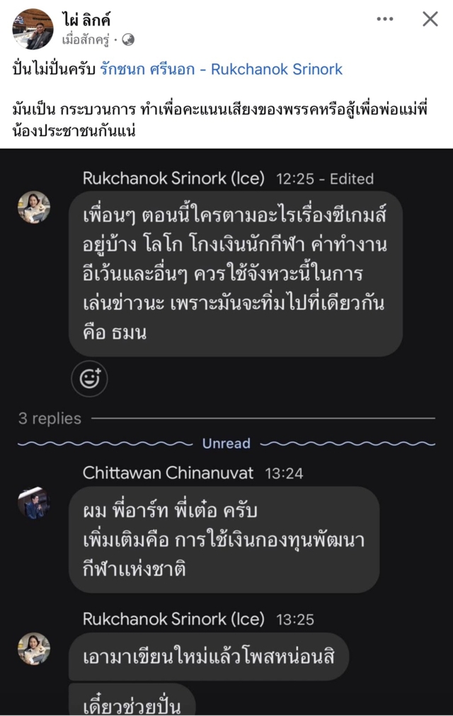 เมื่อเวลา 17.40 น.จากกรณีที่เพจเชียร์ลุง ได้โพสต์ข้อความระบุว่า “ไลน์หลุดพรรคส้มกระหึ่ม social !!ไอซ์ รักชนก อาสาปั่นข่าวเพื่อเล่นงานธรรมนัส ข้อความชัดเจน "ควรใช้จังหวะนี้ในการเล่นข่าว เพราะมันจะทิ่มไปที่เดียวกันคือ ธมน." !!!!!”