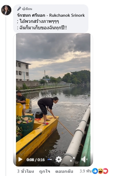 จากนั้นได้คอมเมนต์ใต้โพสต์ โดยโพสต์คลิปขณะเก็บกระทง และข้อความว่า ไอ้พวกสร้างภาพๆๆๆ ฉันก็มาเก็บของฉันทุกปี!!