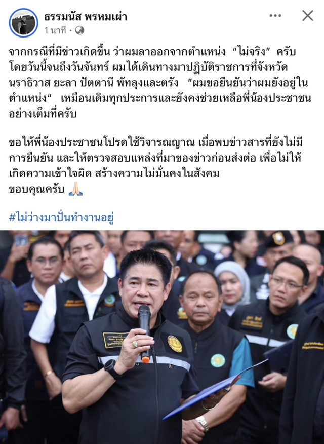 เมื่อวันที่ 7 พ.ย.68 เวลา 20.00 น.ร.อ.ธรรมนัส พรหมเผ่า รองนายกรัฐมนตรี และรัฐมนตรีว่าการกระทรวงเกษตรและสหกรณ์ โพสต์เฟสบุ๊คส่วนตัวว่า “จากกรณีที่มีข่าวเกิดขึ้น ว่าผมลาออกจากตำแหน่ง “ไม่จริง” ครับ โดยวันนี้จนถึงวันจันทร์ ผมได้เดินทางมาปฏิบัติราชการที่จังหวัดนราธิวาส ยะลา ปัตตานี พัทลุงและตรัง”ผมขอยืนยันว่าผมยังอยู่ในตำแหน่ง“เหมือนเดิมทุกประการและยังคงช่วยเหลือพี่น้องประชาชนอย่างเต็มที่ครับ”