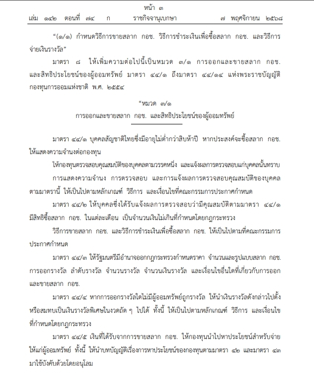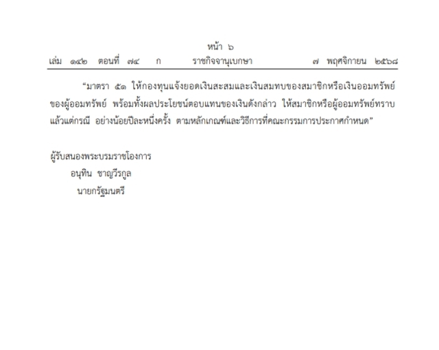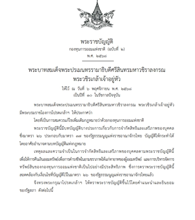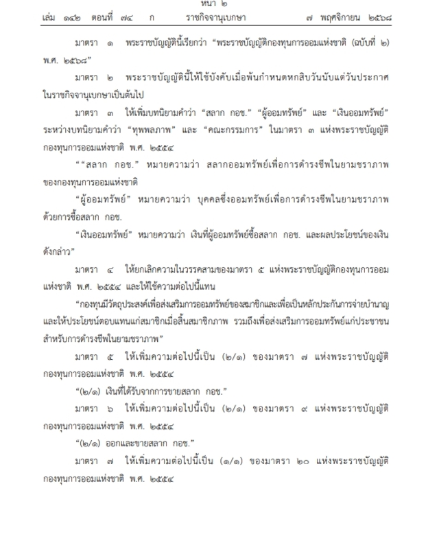 ดร.เผ่าภูมิ โรจนสกุล รองหัวหน้าพรรคเพื่อไทย อดีตรัฐมนตรีช่วยว่าการกระทรวงการคลัง เปิดเผยว่า เมื่อวันที่ 7 พฤศจิกายน ราชกิจจานุเบกษา เผยแพร่ พระราชบัญญัติกองทุนการออมแห่งชาติ (ฉบับที่ 2) พ.ศ. 2568 เป็นที่เรียบร้อยแล้ว