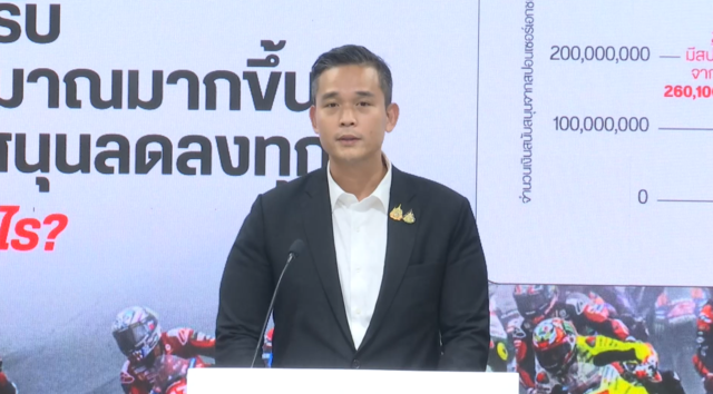 โฆษกพรรคเพื่อไทย ยังกล่าวว่า ต้องการตั้งข้อสังเกตว่า รัฐบาลก่อนหน้านี้ พรรคการเมืองพรรคใดที่ดูแลเรื่องกระทรวงการท่องเที่ยวและกีฬา ซึ่งถ้าดูจากตัวเลขจะเห็นว่าพรรคเอกชน เข้ามาสนับสนุนการจัดงานน้อยลงเรื่อยๆ ตัวเลขเหล่านี้กำลังบอกว่า การประมาณการของผู้เข้าชมที่มีจำนวนน้อยลงเรื่อยๆ คำถามก็คือตัวเลขเหล่านี้กำลังบอกเราว่าคืออะไร หรือเป็นเพราะว่าตัวเลขประมาณการผู้เข้าชมที่หน่วยงานรัฐบาลเสนอบอกชัดเจนว่า ผู้เข้าชมน้อยลงเรื่อยๆ ทำให้ตัวเลขผลตอบแทนทางเศรษฐกิจน้อยลง ถึงขั้นที่จะไม่คุ้มค่าให้การสนับสนุนหรือไม่