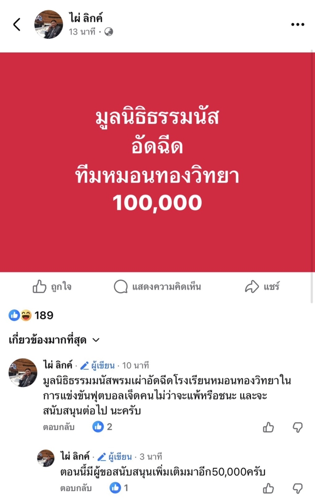 (8 พ.ย. 2568) เวลา 17.05 น. นายไผ่ ลิกค์ สส.กำแพงเพชร พรรคกล้าธรรม (กธ.) เปิดเผยว่า มูลนิธิธรรมนัส พรหมเผ่า เพื่อการกุศล ได้มอบเงินอัดฉีดจำนวน 100,000 บาท และในส่วนของตนมีผู้ขอสนับสนุนมาเพิ่มเติมอีก 50,000 บาท ให้กับทีมฟุตบอลโรงเรียนหมอนทองวิทยา เพื่อเป็นขวัญและกำลังใจในการแข่งขันฟุตบอล 7 คน