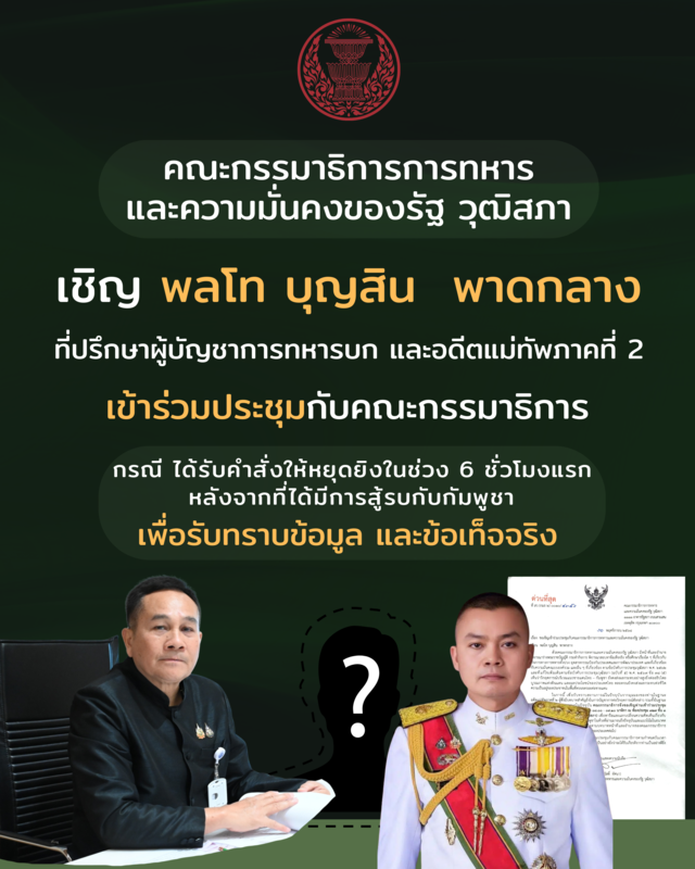 โดยทางกมธ.จะเร่งเปิดประชุมเป็นการด่วน เพราะ เห็นว่า สถานการณ์บริเวณแนวชายแดนไทย กัมพูชา มีความละเอียดอ่อนและกระทบต่อความมั่นคง อธิปไตยและบูรณภาพแห่งดินแดน จึงมีความสำคัญเร่งด่วนที่จะต้องรับทราบข้อมูลโดยเร็วที่สุดเนื่องจากกรณีดังกล่าวอาจมีผลกระทบรุนแรงต่อความมั่นคงของชาติ ทาง กมธ.จึงเห็นควรเชิญ พล.ท.บุญสิน เข้าร่วมประชุมเพื่อรับทราบข้อมูลข้อเท็จจริงและหารือแลกเปลี่ยนความคิดเห็นเกี่ยวกับสถานการณ์แนวชายแดนไทย-กัมพูชา เพื่อเป็นประโยชน์ต่อการปฏิบัติภารกิจ ตามบทบาท หน้าที่ และอำนาจของกมธ. โดยได้มีหนังสือเรียนเชิญ พล.ท.บุญสิน เข้าร่วมประชุมด้วย
