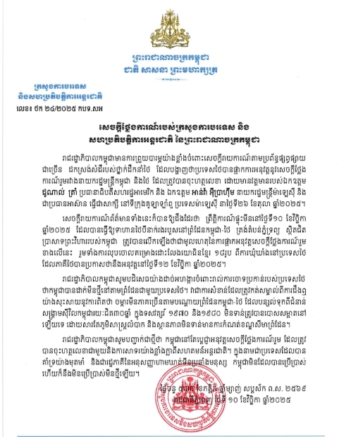 ต่อมา กระทรวงการต่างประเทศและความร่วมมือระหว่างประเทศกัมพูชา ออกแถลงการณ์ เมื่อคืนวันที่ 10 พ.ย. 68 ระบุว่า รัฐบาลกัมพูชากังวลอย่างยิ่งต่อการรายงานข่าวของหลายสื่อของไทย ที่อ้างคำกล่าวของผู้นำไทยที่ระบุว่า ไทยได้ระงับการปฏิบัติตามการลงนามในถ้อยแถลงผลการหารือระหว่างนายกรัฐมนตรีไทยและนายกรัฐมนตรีกัมพูชา ซึ่งมีโดนัลด์ ทรัมป์ ประธานาธิบดีสหรัฐฯ และอันวาร์ อิบราฮิม นายกรัฐมนตรีมาเลเซียและประธานอาเซียนปีนี้ ร่วมลงนามและเป็นสักขีพยานด้วย