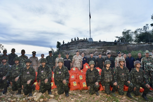 ภายหลัง นายกรัฐมนตรีพร้อมคณะได้ มอบถุงยังชีพให้กับทหารแนวหน้า ก่อนจะเดินขึ้นเนินภูมะเขือ เพื่อตรวจสอบเส้นทางธรรมชาติ และร่วมยืนตรงเคารพธงชาติที่เสาธงร่วมกับนายทหาร