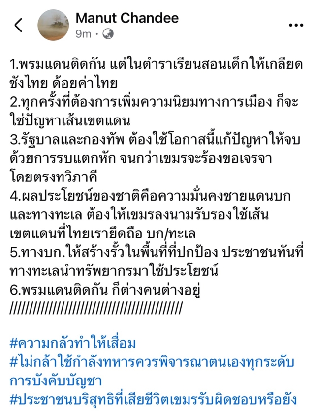 พร้อมติดแฮชแท็ก #ความกลัวทำให้เสื่อม #ไม่กล้าใช้กำลังทหารควรพิจารณาตนเองทุกระดับการบังคับบัญชา #ประชาชนบริสุทธิที่เสียชีวิตเขมรรับผิดชอบหรือยัง