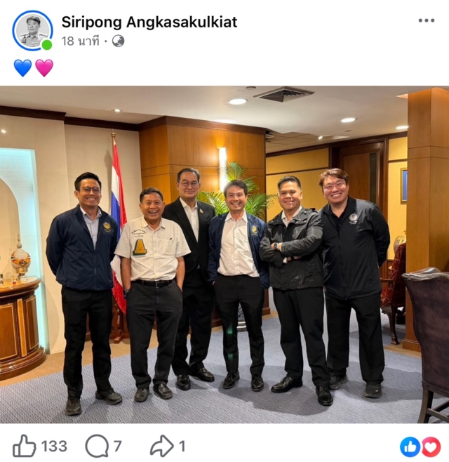 วันนี้ (12 พ.ย. 68) นายสิริพงศ์ อังคสกุลเกียรติ โฆษกประจำสำนักนายกรัฐมนตรี โพสต์ภาพผ่านเฟซบุ๊กส่วนตัว พร้อมระบุแคปชั่น เป็นหัวใจสีน้ำเงิน และหัวใจสีชมพู โดยภายในภาพมีนายสิริพงศ์ ยืนร่วมกับนายวราวุธ ศิลปอาชา หัวหน้าพรรคชาติไทยพัฒนา นายนิกร จำนง แกนนำพรรคชาติไทยพัฒนา นายภราดร ปริศนานันทกุล รัฐมนตรีประจำสำนักนายกรัฐมนตรี นายกรวีร์ ปริศนานันทกุล สส. และนายสมศักดิ์ ปริศนานันทกุล อดีตรัฐมนตรีว่าการกระทรวงศึกษาธิการ อยู่ในภาพด้วย