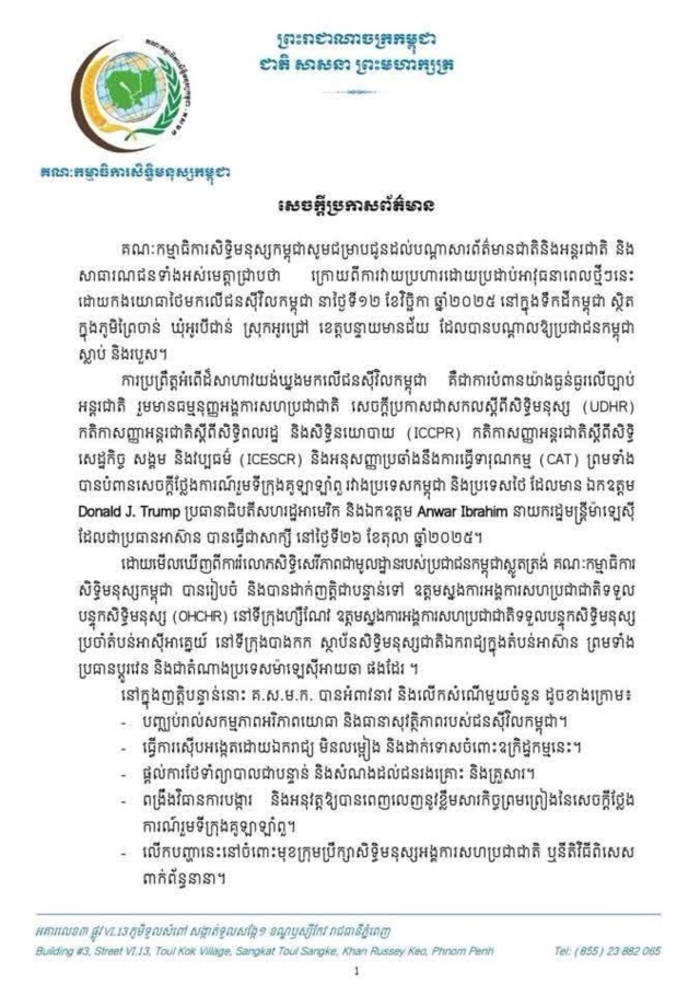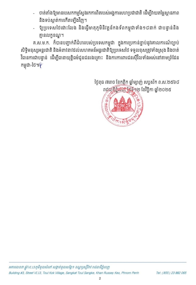 วันที่ 13 พ.ย. 68 ผู้สื่อข่าวรายงานว่า คณะกรรมการสิทธิมนุษยชนกัมพูชา ได้ออกแถลงการณ์แจ้งให้สื่อมวลชน ทั้งในประเทศและต่างประเทศ รวมถึงประชาชนทั่วไปทราบว่า หลังจากที่กองทัพไทยได้โจมตีพลเรือนชาวกัมพูชาด้วยอาวุธ เมื่อวันที่ 12 พ.ย. 68 ในเขตพื้นที่กัมพูชา ณ หมู่บ้านเปรยจัน ตำบลโอเบโจน อำเภอโอชรอฟ จังหวัด บ็อนเตียย์เมียนเจ็ย ส่งผลให้ประชาชนชาวกัมพูชาเสียชีวิต และได้รับบาดเจ็บ