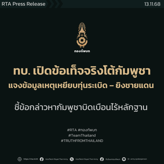 รวมทั้งสถานการณ์เมื่อวานนี้ (12 พ.ย. 2568) ที่พบว่าฝ่ายกัมพูชาใช้การสร้างสถานการณ์ ให้กำลังทหารเปิดฉากยิงเข้ามาในพื้นที่ฝั่งไทยในบริเวณบ้านหนองหญ้าแก้ว จ.สระแก้ว จนฝ่ายไทยต้องตอบโต้สถานการณ์ตามกฎการใช้กำลัง เพื่อป้องกันตนเองและดูแลความปลอดภัยให้ประชาชนชาวไทย ซึ่งหลังจากเกิดเหตุการณ์ ฝ่ายกัมพูชาได้มีการปฏิบัติการข้อมูลข่าวสารสร้างข่าวบิดเบือนอย่างกว้างขวาง โดยกล่าวหาว่าไทยได้เปิดฉากยิงพลเรือนกัมพูชา และเป็นฝ่ายละเมิดข้อตกลง พร้อมทั้งเรียกร้องให้ไทยปล่อยตัวเชลยศึกในทันทีโดยไม่มีเงื่อนไข