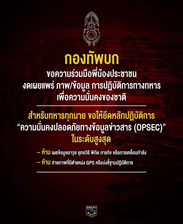 ความมั่นคงของชาติ เริ่มต้นที่วินัยของเรา ร่วมกันใช้โซเชียลมีเดียอย่างระมัดระวัง เพื่อความปลอดภัยของกำลังพลแนวหน้า และเพื่อให้ประเทศไทยมั่นคง แข็งแกร่ง บนพื้นฐานของความรับผิดชอบร่วมกัน