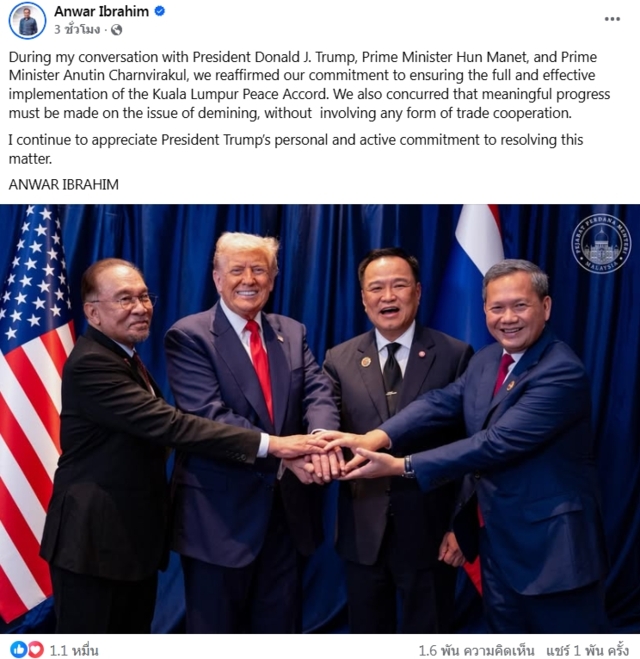 วันที่ 16 พ.ย. 68 อันวาร์ อิบราฮิม นายกรัฐมนตรีมาเลเซีย โพสต์เฟซบุ๊กภายหลังการหารือทางโทรศัพท์ประเด็นไทย-กัมพูชา ร่วมกับนายกรัฐมนตรีอนุทิน กับโดนัลด์ ทรัมป์ ประธานาธิบดีสหรัฐฯ เมื่อวันที่ 15 พ.ย. ที่ผ่านมา