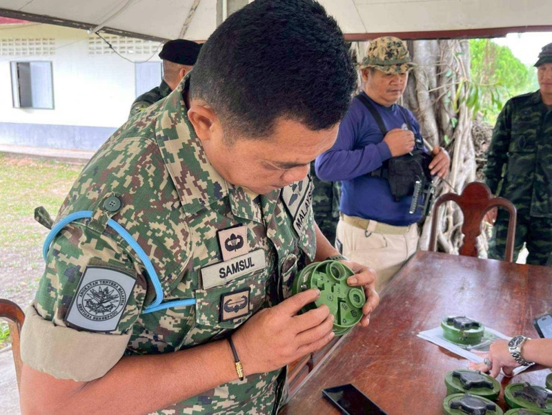 หลังจากนั้นทางคณะได้ดูทุ่นระเบิดที่ทางฝ่ายไทยเก็บกู้ได้ในพื้นที่ รวมทั้งทาง AOT ได้ความสนใจและได้สอบถามกับทางเจ้าหน้าที่ทหารที่ตรวจพบและเก็บกู้ทุ่นระเบิด โดยเป็นการสอบถามถึงวันและเวลาที่ตรวจพบ รวมถึงจุดที่ตรวจพบ ทั้งนี้มีชิ้นส่วนต่างๆ ที่ตรวจพบในที่เกิดเหตุ เพื่อนำมาประกอบหลักฐานความสอดคล้องว่าเป็น ระเบิดที่นำมาวางใหม่หรือไม่อย่างไร