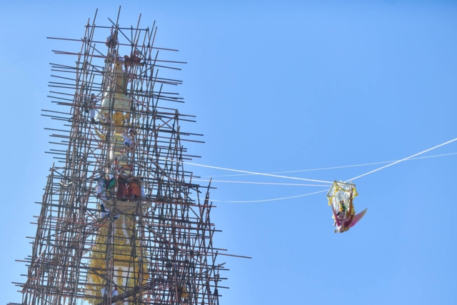 จากนั้นสมเด็จพระมหาวีรวงศ์ เจิมยอดฉัตรทองคำและผูกผ้ามงคล และเมตตาให้พระเทพวิสุทธิคุณ เจ้าอาวาสวัดหนองแวง นายกรัฐมนตรี ร่วมผูกผ้ามงคล และทำการประกอบพิธียกยอดฉัตรทองคำ โดยพระสงฆ์ทรงสมณศักดิ์ 10 รูป เจริญชัยมงคลคาถา นายกรัฐมนตรี ถวายเครื่องไทยธรรม ตามลำดับ เป็นอันจบพิธี ท่ามกลางประชาชนพุทธศาสนิกชนที่ร่วมพิธีมงคลจำนวนมาก