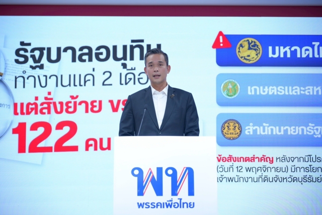 นายศึกษิษฏ์ ศรีจอมขวัญ โฆษกพรรคเพื่อไทย แถลงข่าวประจำสัปดาห์แสดงความกังวลเรื่องการโยกย้ายข้าราชการระดับสูงของรัฐบาลอนุทิน ชาญวีรกูล เป็นจำนวนมากถึง 122 คนว่าเป็นไปตามกฎหมายและระเบียบหรือไม่ พร้อมตั้งข้อสังเกตการโยกย้ายข้าราชการเหล่านี้จะส่งผลถึงการเอื้อประโยชน์หรือเกี่ยวข้องกับการเลือกตั้งใหญ่ที่จะมาถึงหรือไม่อย่างไร