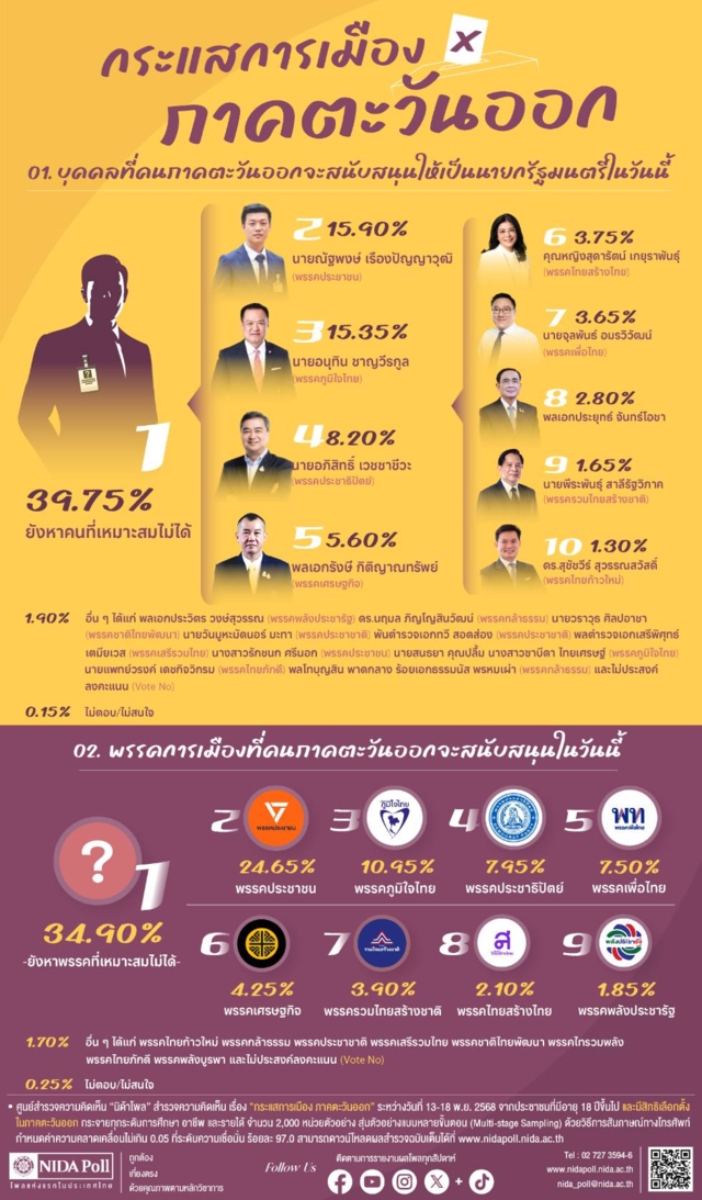 ศูนย์สำรวจความคิดเห็น “นิด้าโพล” สถาบันบัณฑิตพัฒนบริหารศาสตร์ (นิด้า) เปิดเผยผลการสำรวจ เรื่อง “กระแสการเมือง ภาคตะวันออก” ทำการสำรวจระหว่างวันที่ 13 - 18 พฤศจิกายน 2568 จากประชาชนที่มีอายุ 18 ปีขึ้นไป และมีสิทธิเลือกตั้งในภาคตะวันออก (จำนวน 8 จังหวัด ประกอบด้วย ฉะเชิงเทรา ชลบุรี ระยอง จันทบุรี ตราด นครนายก ปราจีนบุรี และสระแก้ว อ้างอิงตามประกาศคณะกรรมการนโยบายการบริหารงานจังหวัดและกลุ่มจังหวัดแบบบูรณาการเรื่องการจัดตั้งกลุ่มจังหวัดและกำหนดจังหวัดที่เป็นศูนย์ปฏิบัติการของกลุ่มจังหวัด (ฉบับที่ 3) (2560, 17 พฤศจิกายน) ราชกิจจานุเบกษา. เล่มที่ 134 [ตอนพิเศษ 281 ง]. หน้า [14]) กระจายทุกระดับการศึกษา อาชีพ และรายได้ รวมจำนวนทั้งสิ้น 2,000 หน่วยตัวอย่าง เกี่ยวกับกระแสการเมือง ภาคตะวันออก การสำรวจอาศัยการสุ่มตัวอย่างโดยใช้ความน่าจะเป็นจากบัญชีรายชื่อฐานข้อมูลตัวอย่างหลัก (Master Sample) ของ “นิด้าโพล” สุ่มตัวอย่างแบบหลายขั้นตอน (Multi-stage Sampling) เก็บข้อมูลด้วยวิธีการสัมภาษณ์ทางโทรศัพท์ โดยกำหนดค่าความคลาดเคลื่อนไม่เกิน 0.05 ที่ระดับความเชื่อมั่นร้อยละ 97.0