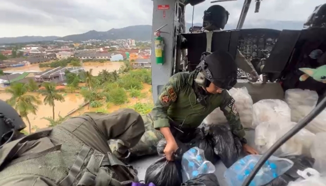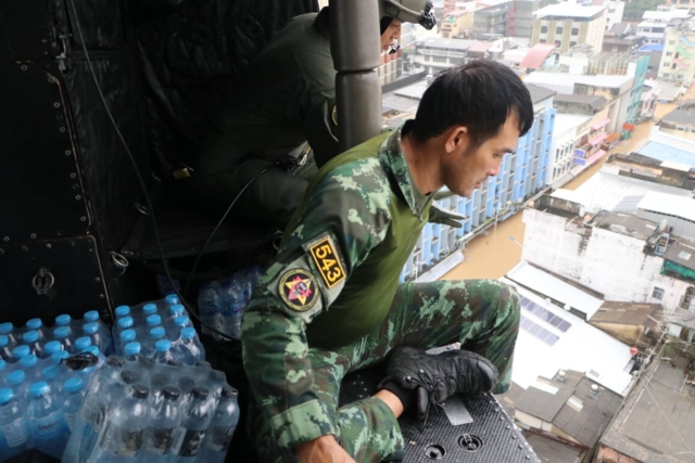 พล.ท.นรธิป โพยนอก แม่ทัพภาคที่4 ได้สั่งการให้มีการระดมกำลัง เฮลิคอปเตอร์เพื่อปฏิบัติภารกิจช่วยเหลือผู้ประสบอุทกภัยอย่างเร่งด่วน โดยมีวัตถุประสงค์หลักคือ การสำรวจเส้นทางคมนาคม รวมถึงการส่งมอบอาหารและน้ำดื่มทางอากาศ ภารกิจนี้จะมุ่งเน้นการช่วยเหลือใน 3 จุด คือ เทศบาลนครหาดใหญ่ , โรงเรียนเทศบาล 2 (บ้านหาดใหญ่) และ บริเวณท่าแซ รวมถึงแคมป์คนงานก่อสร้าง ภารกิจนี้ได้รับการสนับสนุน เฮลิคอปเตอร์ อากาศยาน 212 จาก กองทัพภาคที่2 โดยจะดำเนินการช่วยเหลือผู้ประสบอุทกภัยในพื้นที่ดังกล่าวอย่างต่อเนื่องตลอดทั้งวัน