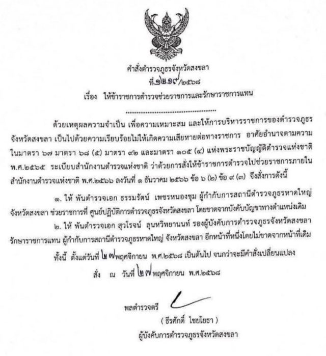 เมื่อวันที่ 27 พ.ย.68 มีคำสั่งตำรวจภูธรจังหวัดสงขลาที่ 1219/2568 เรื่องให้ข้าราชการตำรวจช่วยราชการและรักษาราชการแทน ด้วยเหตุผลความจำเป็น เพื่อความเหมาะสม และให้การบริหารราชการของตำรวจภูธรจังหวัดสงขลา เป็นไปด้วยความเรียบร้อยไม่ให้เกิดความเสียหายต่อทางราชการ