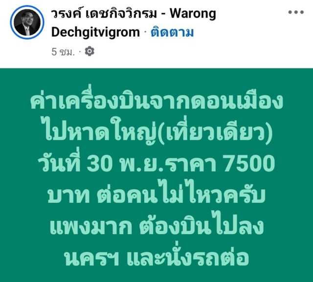 "ค่าเครื่องบินจากดอนเมือง ไปหาดใหญ่(เที่ยวเดียว) วันที่ 30 พ.ย.ราคา 7500 บาท ต่อคนไม่ไหวครับ แพงมาก ต้องบินไปลงนครฯ และนั่งรถต่อ"