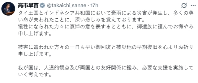 วันที่ 1 ธ.ค. 68 เฟซบุ๊กเพจ “Embassy of Japan in Thailand/สถานเอกอัครราชทูตญี่ปุ่นประจำประเทศไทย” โพสต์ข้อความระบุว่า “สารแสดงความเสียใจของนางทากาอิจิ ซานาเอะ นายกรัฐมนตรีญี่ปุ่นต่อเหตุการณ์อุทกภัยในประเทศไทย และประเทศอินโดนีเซีย”