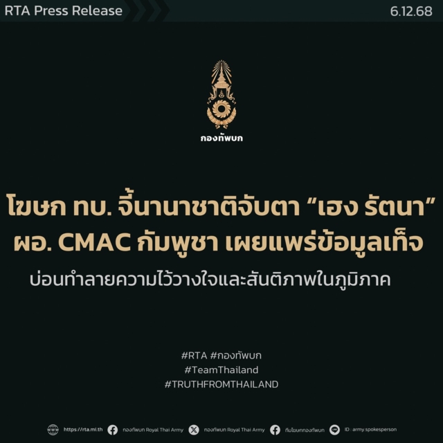 รวมถึงกล่าวหาว่า ไทยพยายามเบี่ยงเบนความสนใจของนานาชาติจาก “การรุกรานและยึดครองดินแดนกัมพูชา” โดยกล่าวโทษว่าฝ่ายกัมพูชาวางทุ่นระเบิดใหม่จนทำให้ทหารไทยเสียชีวิต และใช้ถ้อยคำเปรียบไทยว่าเป็น “โจรที่กลับฟ้องเจ้าของที่ดิน” พร้อมอ้างว่า หากไทยไม่ “บุกเข้ามายึดครองพื้นที่ของกัมพูชา” ก็จะไม่เกิดเหตุใดๆ กับกำลังพลไทยนั้น