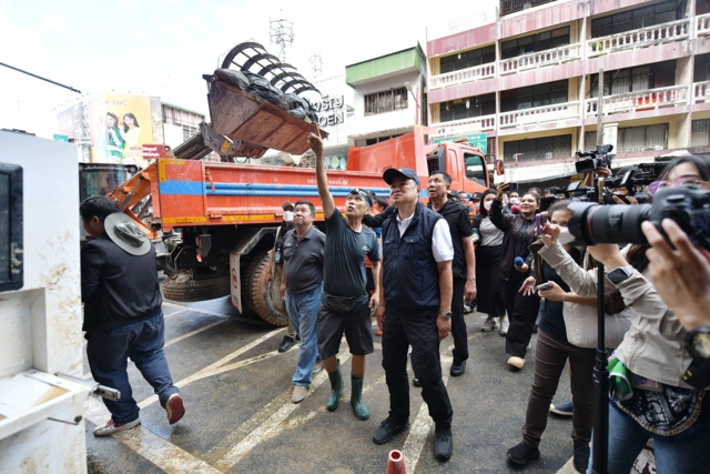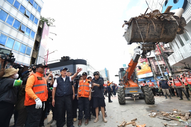 นายกฯ ยังได้ดูการจัดเก็บขยะและล้างถนนเพื่อเคลียร์พื้นที่ให้ประชาชน โดยใช้รถตักเอนกประสงค์หรือรถแมงมุม 1 คัน รถคีบ 9 คัน และรถดั๊ม 30 คัน ของกรมป้องกันและบรรเทาสาธารณภัย (ปภ.) ที่เข้ามาช่วยในการขนย้ายขยะ ก่อนนายกฯเดินสอบถามการปฎิบัติงานของเจ้าหน้าที่ และอาสาสมัครรักษาดินแดน (อส.) จากจังหวัดต่างๆ พร้อมกล่าวขอบคุณที่มาช่วยปฎิบัติงาน และสอบถามเรื่องที่พักและอาหารหากไม่เพียงพอขอให้บอก