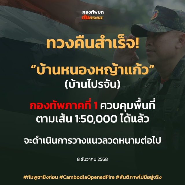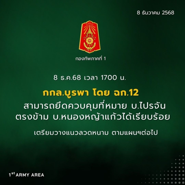 (8 ธ.ค. 2568) เพจ กองทัพภาคที่ 1 ได้โพสต์ข้อความรายงานว่า ศูนย์ปฏิบัติการกองทัพภาคที่ 1 ได้ขอรายงานความคืบหน้า เมื่อเวลา 17.00 น.
