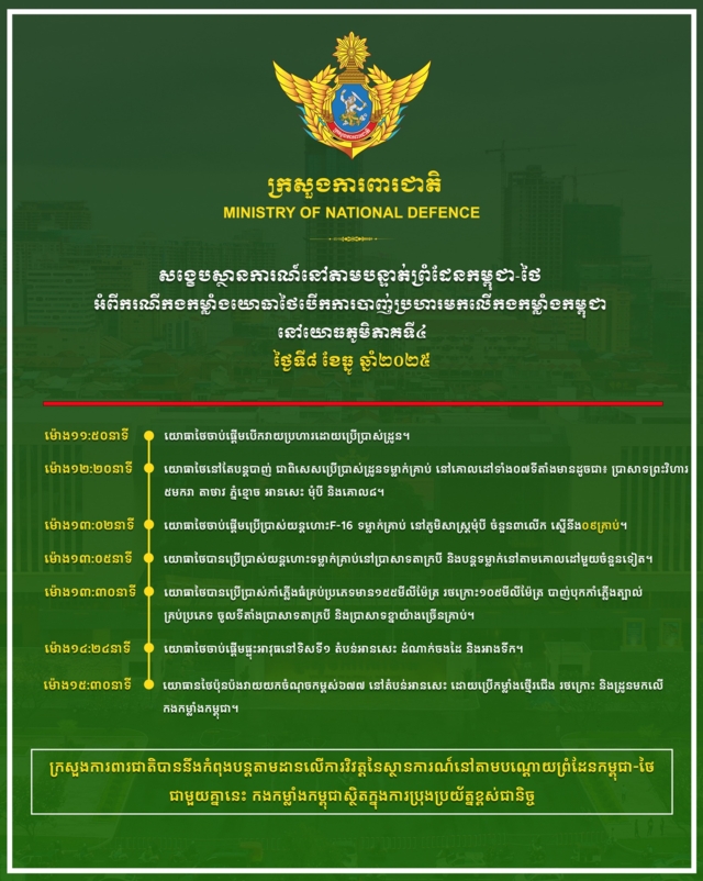 กระทรวงกลาโหมกัมพูชา ได้ออกแถลงการณ์ถึงสถานการณ์ตามแนวชายแดนกัมพูชา-ไทย โดยระบุว่า กองกำลังทหารไทยได้เปิดฉากยิงโจมตีใส่กองกำลังกัมพูชาในพื้นที่กองทัพภาคที่ 4 ในวันนี้ (8 ธันวาคม 2025)