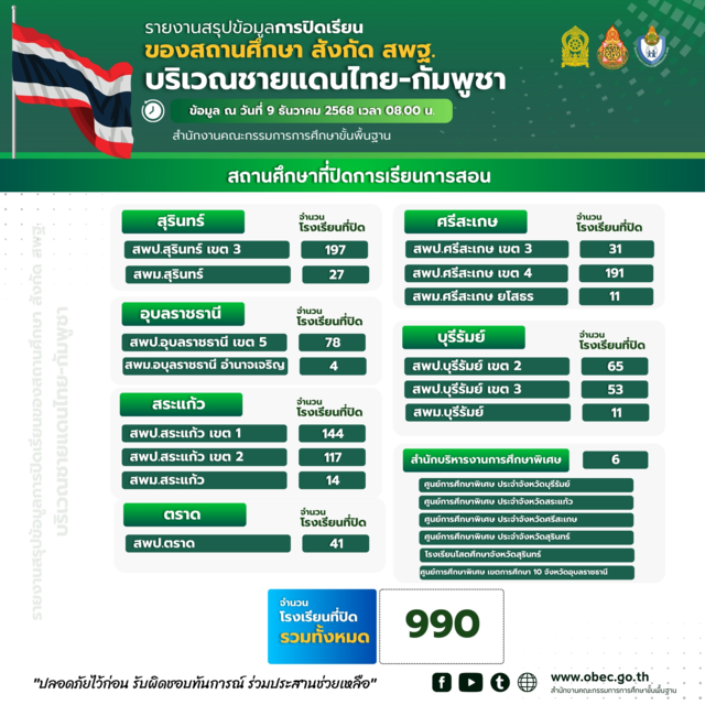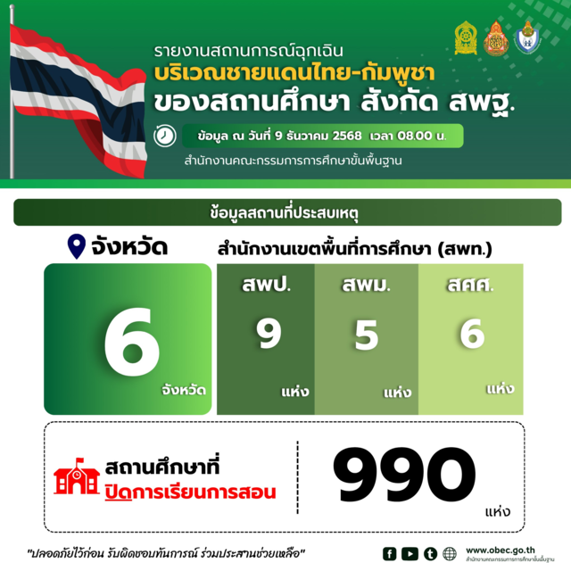(9 ธ.ค. 2568) เวลา 09.30 น. ศ.ดร.นฤมล ภิญโญสินวัฒน์ รัฐมนตรีว่าการกระทรวงศึกษาธิการ เปิดเผยความคืบหน้าสถานการณ์ชายแดนไทย-กัมพูชา ที่เกิดการปะทะอย่างต่อเนื่องในหลายจุด ส่งผลให้ชุมชนพื้นที่ชายแดนต้องเฝ้าระวังสูงสุด โรงเรียนจำนวนมากได้รับผลกระทบโดยตรง ต้องหยุดการเรียนการสอนชั่วคราวเพื่อความปลอดภัยของนักเรียนและบุคลากรในสังกัด โดยข้อมูลล่าสุดพบว่า สถานศึกษาที่สั่งปิดเรียนชั่วคราวมีทั้งสิ้น 990 แห่ง ครอบคลุมพื้นที่ 6 จังหวัด ได้แก่ สุรินทร์ ศรีสะเกษ บุรีรัมย์ สระแก้ว อุบลราชธานี และตราด ซึ่งส่วนใหญ่อยู่ในพื้นที่ใกล้แนวปะทะและเสี่ยงต่อสถานการณ์ความไม่สงบ