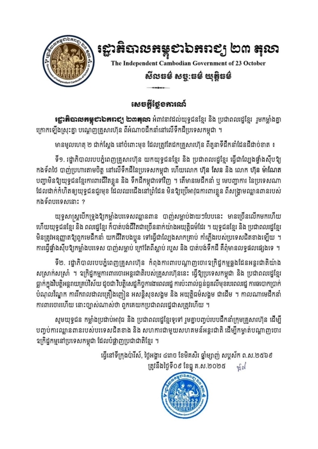 วันที่ 9 ธ.ค.2568 นายสม รังสี อดีตผู้นำฝ่ายค้านกัมพูชา โพสต์เอกสารแถลงการณ์ 2 ภาษาในนามรัฐบาลอิสระ จากปารีส ประกอบด้วยภาษาอังกฤษ และภาษากัมพูชา