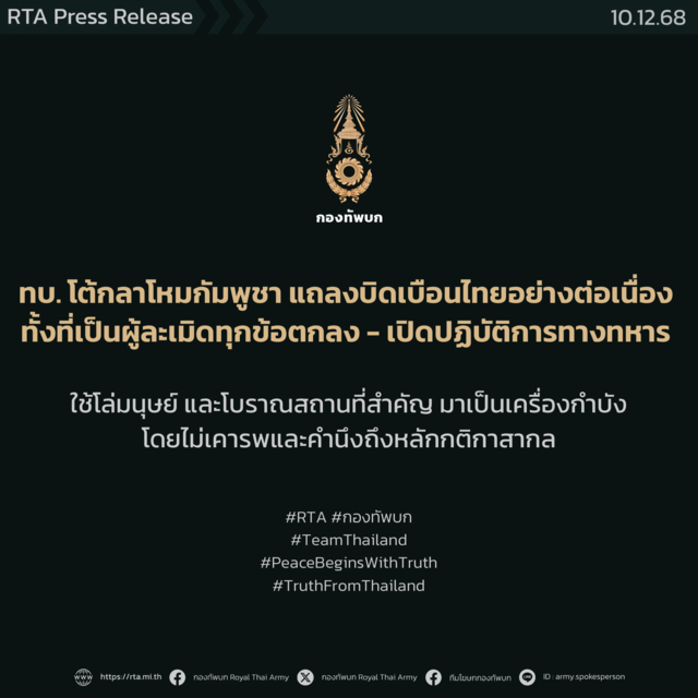 กองทัพบกขอประณามการกระทำของกัมพูชา ซึ่งละเมิดต่อข้อตกลงหยุดยิงทุกข้อ และหลักกฎหมายมนุษยธรรมสากลในทุกด้าน โดยขอให้ยุติการดำเนินการต่างๆ ที่อาจส่งผลกระทบในบริเวณกว้าง ซึ่งไม่เกี่ยวข้องกับปฏิบัติการทางทหาร และขัดต่อแนวทางในการดำเนินการสู่สันติภาพ อันจะทำให้ความขัดแย้งในพื้นที่ชายแดนทวีความรุนแรงมากยิ่งขึ้น