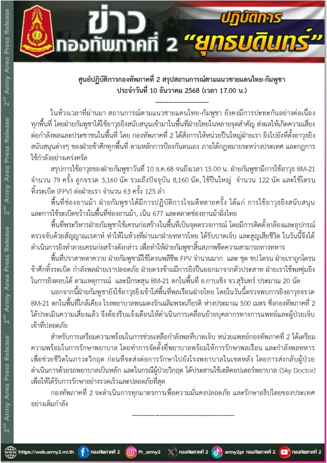 สถานการณ์โดยรวมในไม่กี่ชั่วโมงที่ผ่านมา สถานการณ์ตามแนวชายแดนไทย – กัมพูชายังคงมีการปะทะกันทั่วทุกภาคส่วน กองกําลังกัมพูชาได้ใช้การสนับสนุนไฟไหม้เข้าไปในดินแดนไทยในหลายแห่งที่สําคัญ สร้างความเสี่ยงให้กับกองกําลังไทยและพลเรือนในท้องถิ่น เขตกองทัพบกที่สองจึงสั่งให้หน่วยปืนใหญ่ของเรายิงตําแหน่งที่สนับสนุนการยิงต่างๆของศัตรูในทุกพื้นที่ ตามหลักการป้องกันตัวเองภายใต้กฎหมายระหว่างประเทศอย่างเคร่งครัดและยึดมั่นในกฎระเบียบเกี่ยวกับการใช้กําลังอย่างเคร่งครัด
