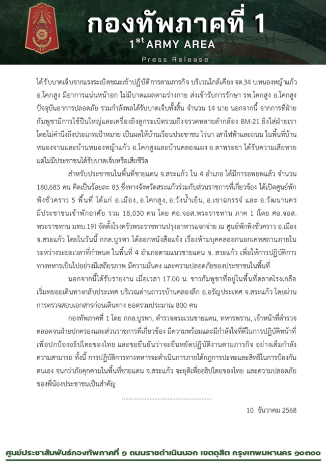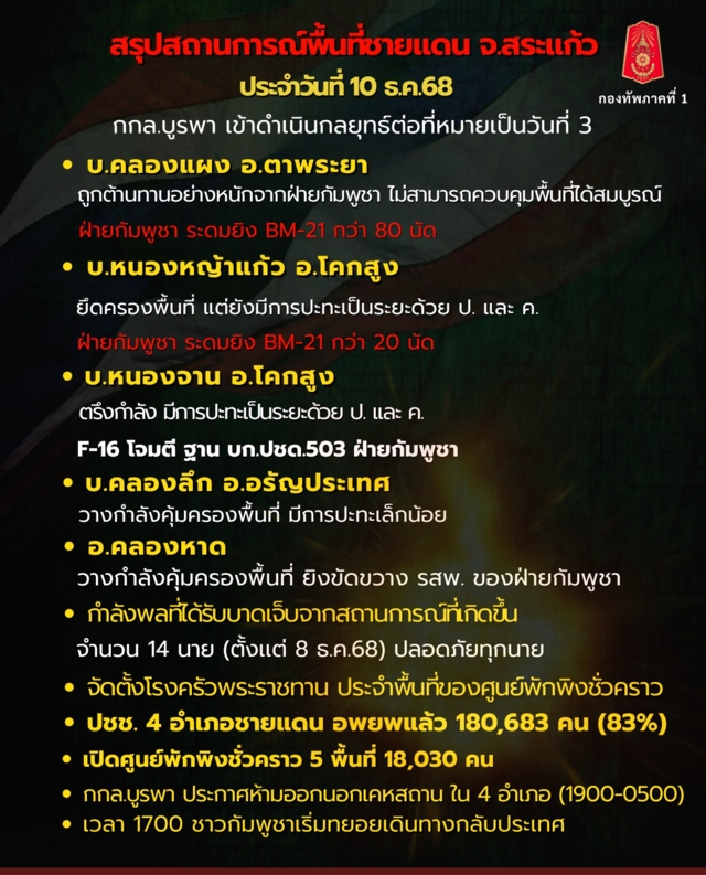 ศูนย์ปฏิบัติการกองทัพภาคที่ 1 สรุปสถานการณ์ชายแดนไทย-กัมพูชา พื้นที่ จ.สระแก้ว ประจำวัน 10 ธันวาคม 2568 เวลา 18.00 น.