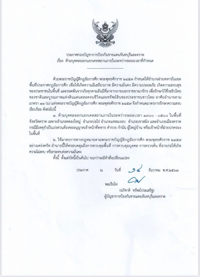 ล่าสุดกองบัญชาการป้องกันชายแดนจันทบุรีและตราดออกประกาศก เรื่อง ห้ามบุคคลออกนอกเคหสถานภายในระยะเวลาที่กำหนด