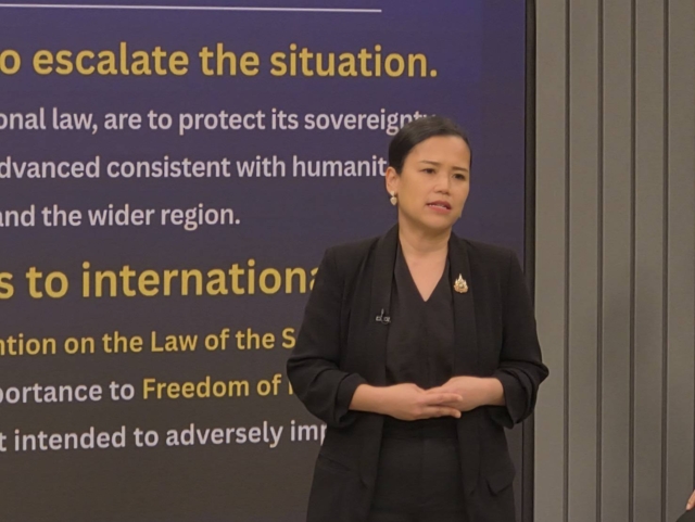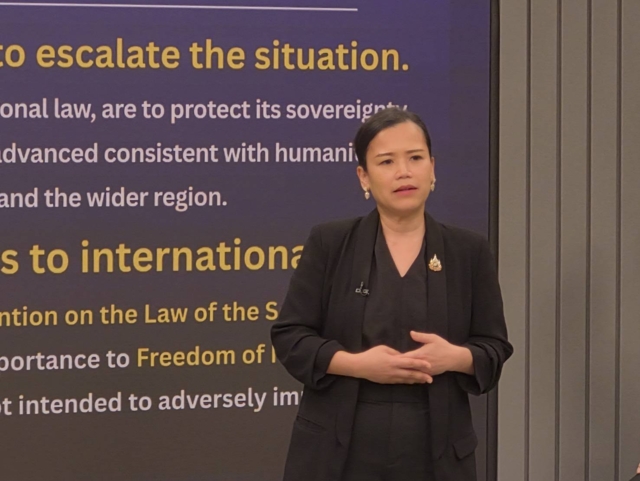 วันนี้ (15 ธันวาคม 2568) เมื่อเวลา 16.00 น. ณ ศูนย์แถลงข่าวร่วมสถานการณ์ชายแดนไทย-กัมพูชา นางมาระตี นะลิตา อันดาโม รองโฆษกกระทรวงการต่างประเทศ เผยว่า สำหรับประเด็นที่เป็นกระแสข่าวในโซเชียลมีเดียว่า ประเทศไทยกำลังมีการดำเนินการเกี่ยวกับอ่าวไทย หรือน่านน้ำไทยนั้น ซึ่งตนขอยืนยันว่า ทางประเทศไทยไม่สนใจยกระดับสถานการณ์ใดๆ รวมถึงผลกระทบที่อาจจะตามมาจากการยกระดับสถานการณ์ ซึ่งการดำเนินการของฝ่ายไทยเป็นการปกป้องอธิปไตย คือความมั่นคงและปลอดภัยของพี่น้องประชาชนไม่มีเจตนารมย์ใดๆ ที่จะหยุดระดับความรุนแรง ซึ่งการปฎิบัติการของเราก็เป็นไปตามหลักมนุษยธรรมกฎหมายระหว่างประเทศอย่างชัดเจน