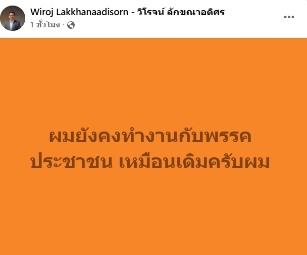 ล่าสุด นายวิโรจน์ ลักขณาอดิศร อดีต สส.บัญชีรายชื่อ และรองหัวหน้าพรรคประชาชน โพสต์ข้อความผ่านเฟซบุ๊ก ความว่า “ผมยังคงทำงานกับพรรคประชาชน เหมือนเดิมครับ”