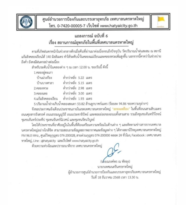 วันที่ 18 ธ.ค. 68 นาย สิริพงศ์ อังคสกุลเกียรติ โฆษกประจำสำนักนายกรัฐมนตรี เปิดเผยว่า ศูนย์อำนวยการป้องกันและบรรเทาอุทกภัยเทศบาลนครหาดใหญ่ จ.สงขลา ได้ออกแถลงการณ์ ฉบับที่ 6 เรื่อง สถานการณ์อุทกภัยในพื้นที่เทศบาลนครหาดใหญ่ ระบุว่า จากสถานการณ์ฝนตกหนักในช่วงกลางดึกเมื่อคืนที่ผ่านมา (17 ธ.ค. 68) และตกอย่างต่อเนื่องจนถึงปัจจุบัน ทำให้มีปริมาณน้ำฝนสะสม ณ สถานีแก้มลิงคลองเรียน วัดได้ 140 มิลลิเมตร ส่งผลให้ระดับน้ำในคลองแม่เรียนและคลองหอยโข่งมีระดับเพิ่มสูงขึ้น โดยคาดการณ์ว่าในช่วงบ่ายถึงค่ำของวันนี้ จะยังคงมีฝนตกอย่างต่อเนื่องในพื้นที่
